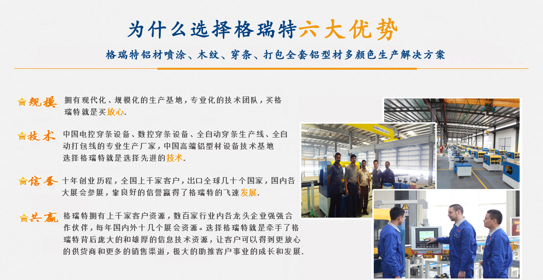 济南格瑞特机械设备有限公司(INGRAT CO.,LTD), 生产隔热断桥铝材穿条设备、铝型材静电喷涂设备、铝型材木纹转印机以及铝型材打包机。公司成立以来主要生产断桥隔热铝型材数控开齿机、数控穿条机、数控滚压复合机、穿条设备、穿条机、铝塑型材复合机、真空木纹转印设备、铝型材打包机、铝型材贴膜机、铝型材静电粉末喷涂设备、全自动铝型材静电粉末喷涂生产线。